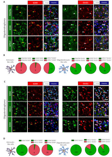 Freshly resected tumors were fixed using 4% paraformaldehyde for 1 h at room temperature (RT), followed by cryopreservation using successive sucrose solutions (10%, 20%, 30%). Tumors were cryosectioned (10 µm), and sections were washed with 0.1 M PBS–glycine to reduce background signals. Permeabilization and blocking were performed with 0.3% Triton X-100 and 10% donkey serum (Sigma, St. Quentin Fallavier, France), followed by overnight incubation with primary antibodies (see Table S4 for the list of antibodies and dilutions) and a one-hour incubation with Alexa 488− or Cy3-conjugated secondary antibodies (Jackson ImmunoResearch, Pennsylvania, US). No primary antibody or antibody against GFP was used as negative control. Nuclei were counterstained using Hoechst 33342. A minimum of 300 cells was counted to distinguish the two nonoverlapping SOX9+ and OLIG1+ subpopulations (Figure 1A and Figure S2A). A minimum of 100 cells was counted to determine the coexpression of specific markers in SOX9+ and OLIG1+ cells. Countings were made in tumor areas containing high cellular density while avoiding infiltrative areas, where the proportion of nontumoral cells can be significant. For cell cultures, coverslips were fixed using 4% paraformaldehyde for 20 min, and immunofluorescences were performed, as for tumor sections, with 0.1% Triton X-100. For staining with O4 antibody, the permeabilization step was omitted. Images were taken using a Zeiss Apotome Z2 microscope.