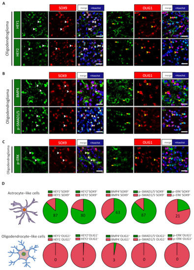 SOX9+ cells express specific signalling proteins and transcription factors. (A–C) Double immunofluorescences in one oligodendroglioma for HEY1, HEY2, BMP4, p-SMAD1/5, and p-ERK with SOX9 and OLIG1 revealed their preferential expression in SOX9+ cells. White arrowheads identify double-positive cells, while yellow arrowheads/arrows show single-positive cells. Scale bars = 20 µm. (D) Pie diagrams representing the percentage of double-positive (green) and single-positive (red) cells in SOX9+ and OLIG1+ cells. Numbers indicate the percentage of double-positive cells.