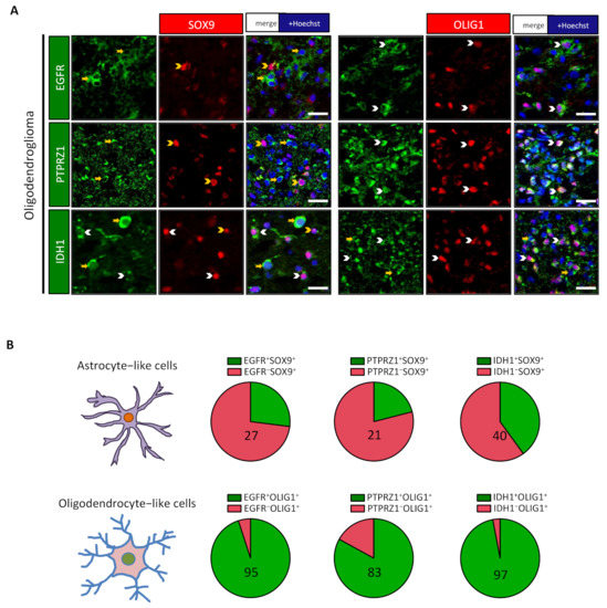 OLIG1+ cells express specific receptors and IDH1. (A) Double immunofluorescences in one oligodendroglioma for EGFR, PTPRZ1, and IDH1 with SOX9 and OLIG1 revealed their preferential expression with OLIG1+ cells. White arrowheads identify double-positive cells, while yellow arrowheads/arrows represent single-positive cells. Scale bars = 20 µm. (B) Pie diagrams representing the percentage of double-positive (green) and single-positive (red) cells in SOX9+ and OLIG1+ cells. Numbers indicate the percentage of double-positive cells.
