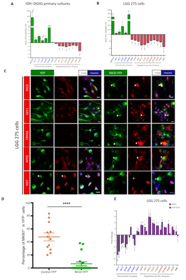 Finally, as we previously found that NOTCH1 activation drastically reduced the rate of proliferation of glioblastoma stem cells [26], we also assessed the effect of NICD on the proliferation of LGG275 cells by measuring the expression of the proliferation marker MKI67 by IF and QPCR. As presented in Figure 5B–D, we observed that NICD expression led to a sharp reduction in proliferation.