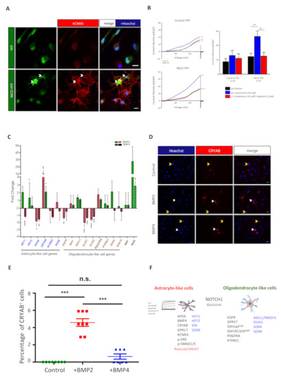 Another unexpected finding is the specific expression of CRYAB in astrocyte-like tumoral cells. This crystallin protein is typically expressed in inflammatory contexts such as multiple sclerosis [53] and has antiapoptotic, neuroprotective, and anti-inflammatory functions [54]. In cancer, CRYAB can act as an oncoprotein or a tumor suppressor [54]. CRYAB is a transcriptional target of BMP signalling [55], and accordingly, we found it to be strongly upregulated by BMP signalling (Figure 6C–E). CRYAB is also upregulated by NICD overexpression in LGG275 cells (Figure 5B), suggesting a potential double regulation by NOTCH1 and BMP signalling. A potential link between CRYAB, NOTCH1, and BMP pathways is also supported by diffuse low-grade glioma RNA profiles in the TCGA database, showing a significant correlation between CRYAB, BMP2, and HEY2 expression (Figure S14). The role of CRYAB in IDH-DGIIG cells is not known and remains to be elucidated.