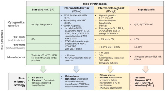 - O’Connor, D.; Enshaei, A.; Bartram, J.; Hancock, J.; Harrison, C.J.; Hough, R.; Samarasinghe, S.; Schwab, C.; Vora, A.; Wade, R.; et al. Genotype-Specific Minimal Residual Disease Interpretation Improves Stratification in Pediatric Acute Lymphoblastic Leukemia. J. Clin. Oncol. 2018, 36, 34–43. [Google Scholar] [CrossRef] [PubMed]