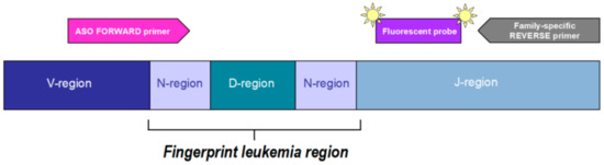 If the patients have been tested negative for chromosomal translocation at diagnosis, the molecular gold standard for MRD monitoring is the amplification of T-cell Receptor (TcR) and Immunoglobulin (Ig) gene rearrangements by Real Time quantitative PCR (RQ-PCR). Unlike the chimeric transcript, Ig/TcR are not directly involved in leukemia pathogenesis, but they mirror physiological events that occur during the ontogenesis of B and T lymphocytes. During lymphocyte differentiation, random insertions/deletions of nucleotides at the junctional sites of V (Variable)–D (Diversity)-J (Junctional) gene segments result in a diversity of antigen receptor; in the case of neoplastic evolution, all the tumor cells will express the same receptor sequence. Therefore, these insertions/deletions are specific to each patient and represent a fingerprint of leukemia. This approach, according to BIOMED-2 protocol [63], includes the identification at diagnosis of V–D-J regions of Ig and TcR gene rearrangements by PCR followed by heteroduplex analysis to distinguish between polyclonal and clonal, leukemia specific rearrangements. Nucleotide sequences of the identified clonal rearrangements are obtained by Sanger method. Allele Specific Oligonucleotides (ASO primer) (Figure 2) are then designed on these leukemia-specific sequences and used in combination with family-specific primers and fluorescent probes to identify and quantify leukemia cells by Quantitative PCR (ASO-qPCR). The fluorescence emission detected by the instrument in a sample is directly proportional to the amount of target DNA present.