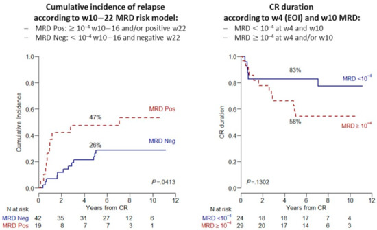 - In the risk stratification process, by analogy with pediatric trials, the analysis of post-induction MRD is crucial since it has been demonstrated to be the most powerful predictive factor for marrow relapse in multivariable analysis from several studies [7,8,9,10]. Therefore, MRD is currently used together with other risk factors for the definition of risk groups and individual risk profiles.