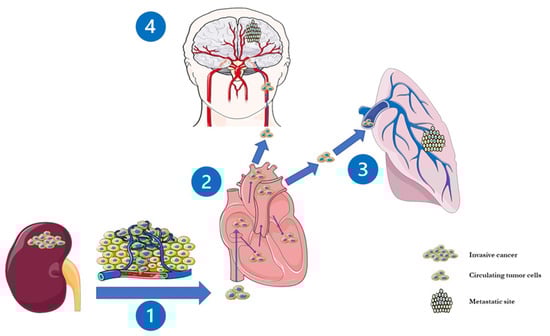 The cava-pathway and subsequent steps in the development of brain metastasis in renal cell carcinoma. The metastatic spread seems to begin with RCC-derived microvesicles CD105+ which break off from the primary tumour site and disseminate through the cava-type hematogenous pathway in 75% of the cases (1). Then, these microvesicles, carrying a cancer stem cell phenotype which stimulate angiogenesis, are transported through the right heart (2) into the pulmonary capillaries and (3) arterial circulation and finally attain the cerebral vasculature (4).