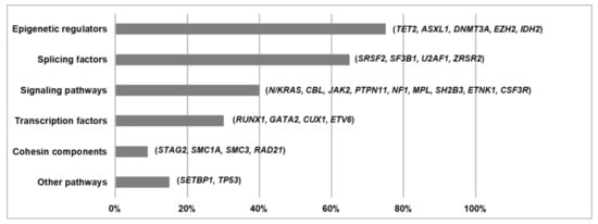 The development of next generation sequencing (NGS) techniques has helped to define the molecular landscape of MDS/MPN. More than 90% of these patients harbor somatic mutations in a group of genes that is common across the spectrum of myeloid neoplasms [4]. Pediatric entity JMML, considered a RASopathy, is primarily characterized by germline and somatic mutations in genes involved in the RAS pathway [38]. In contrast, the spectrum of gene mutations in adult MDS/MPN is much more heterogeneous, with driver genes affecting specific cellular processes that can be categorized according to their function. Mutations recurrently affect epigenetic regulators, splicing factors, genes involved in signaling pathways, transcription factors and cohesin complex components [2,3,4,26,37] (Figure 1B and Figure 2). The acquisition of mutations in these patients occurs in a multi-step manner, as reported in both myeloid and lymphoid neoplasms [49]. Many cases probably arise from previous asymptomatic clonal hematopoiesis, and thus founder driver mutations are frequently found in epigenetic regulators and splicing factors. Secondary acquired driver mutations commonly affect transcription factors and signal transduction genes, which sometimes drive disease progression to AML, along with cell-intrinsic and -extrinsic factors. However, gene mutation frequencies and clonal evolution patterns differ among the four adult MDS/MPN subtypes [4] (Figure 1B and Figure 3).