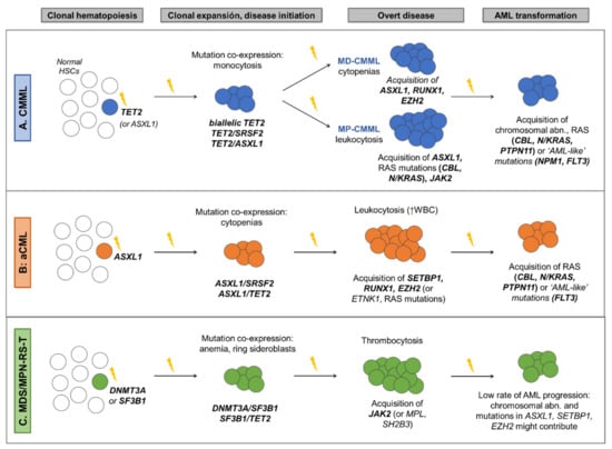Clonal evolution model in adult MDS/MPN. The figure depicts the clonal evolution patterns most frequently observed in CMML (A), aCML (B) and MDS/MPN-RS-T (C). MDS/MPN arise from asymptomatic clonal hematopoiesis. Over time there is clonal expansion that leads to MDS/MPN phenotype and overt disease that, in some cases, eventually progresses to AML. This process takes place through the acquisition of molecular hits (chromosomal abnormalities and gene mutations) that confer to the neoplastic clone a selective advantage. The type of mutations and the order in which they are acquired shapes the disease phenotype and influences the clinical outcome. Based on data from Itzykson et al. [2], Palomo et al. [4], Elena et al. [30], Patnaik et al. [31], Coltro et al. [32], Palomo et al. [33], Meggendorfer et al. [35], Patnaik et al. [26], Steensma et al. [49], Itzykson et al. [50], Ricci et al. [51], Mason et al. [52], Awada et al. [53] and Patel et al. [54]. Abbreviations: aCML: atypical chronic myeloid leukemia; AML: acute myeloid leukemia; CMML: chronic myelomonocytic leukemia; HSCs: hematopoietic stem cells; MD-CMML: myelodysplastic CMML; MDS/MPN-RS-T: myelodysplastic/myeloproliferative neoplasm with ring sideroblasts and thrombocytosis; MDS/MPN-U: myelodysplastic/myeloproliferative neoplasm unclassifiable; MP-CMML: myeloproliferative CMML; WBC: white blood cell count.