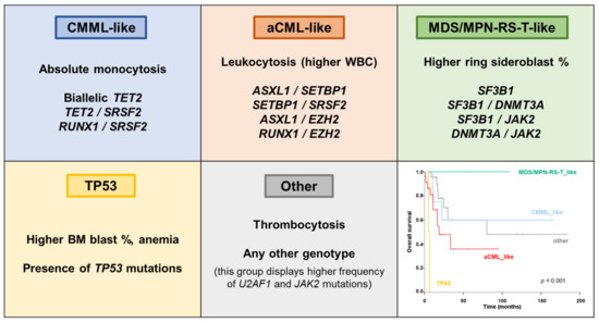 Molecular subtypes of MDS/MPN-U. Molecular classification of MDS/MPN-U based on the presence of specific gene mutation combinations. Morphological features of each subtype are also described in the corresponding panel. Overall survival of molecular subtypes is depicted at the bottom right corner. Based on data from Palomo et al. [4]. Abbreviations: aCML: atypical chronic myeloid leukemia; BM: bone marrow; CMML: chronic myelomonocytic leukemia; MDS/MPN-RS-T: myelodysplastic/myeloproliferative neoplasm with ring sideroblasts and thrombocytosis; WBC: white blood cell count.