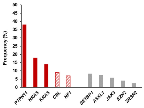 Molecular landscape of JMML. Frequency of recurrent gene mutations in JMML. Red bars represent RAS/MAPK pathway aberrations commonly found in 90% of the cases. Pattern filled bars represent common germline events. Grey bars depict recurrent subclonal secondary events in the disease. Based on data from Sakaguchi et al. [39], Stieglitz et al. [95], Sugimoto et al. [96], Caye et al. [97] and Bresolin et al. [98].