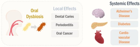 The oral microbiome can affect systemic health conditions, not limited to the dental health (see Figure 1) [55,56]. Epidemiological and experimental evidence supports that oral dysbiosis is closely associated with systemic diseases, including Alzheimer’s disease, diabetes, and cardiovascular disease [57,58,59]. In line with this, the oral microbiota profile was significantly altered in Alzheimer’s disease, such as prevalence of the genera Moraxella, Leptotrichia, and Sphaerochaeta [60]. The oral dysbiotic shifts were associated with the progression of Alzheimer’s disease [61]. Patients with type I diabetes showed higher abundance of the phyla Actinobacteria and Firmicutes compared to healthy controls [62]. Moreover, the enrichment of the genus Anaeroglobus has been reported in the oral micro-biome of patients with symptomatic atherosclerosis [63]. In case of periodontitis, an oral dysbiotic disease, its signature pathogen P. gingivalis infection can induce chronic inflammation locally as well as systemically [64,65]. Moreover, oral dysbiosis can induce production of PAMP signals, such as lipopolysaccharide (LPS), resulting in systemic stimulation of innate immune responses and inflammatory transcription factors, including nuclear factor κB [66,67]. These systemic inflammation and immune responses are thought to be one of the primary mechanisms, underlining that the oral microbiome regulates pathogenesis in distal organs.