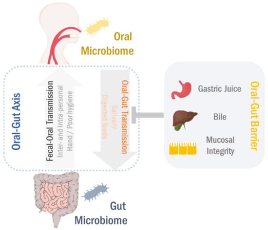 In addition to intrapersonal transmission, the fecal–oral route is considered as an important mechanism for human-to-human transmission of pathogens as well. Enteric viruses, such as hepatitis A virus (HAV) and hepatitis E virus (HEV), are well-known to transmit through the fecal–oral route and thus easily spread by person-to-person contact, particularly in insanitary conditions [94,95,96]. The enteric viruses can interact with the gut microbiota in both direct and indirect manners, resulting in devastating effects on the gut microbial ecosystem [97,98]. HEV infection has been reported to increase the abundance of Lactobacillaceae and Gammaproteobacteria in the fecal samples of patients with acute liver failure [99]. In contrast, supplementation with the probiotic bacterium Enterococcus faecium NCIMB 10415 can effectively promote HEV removal in infected pigs [100]. In addition to enteric viruses, Helicobacter pylori, major causal bacteria of severe gastroduodenal diseases, can transmit via the fecal–oral route as well, showing a correlation with HAV infection [101,102]. Although further investigation is required to understand the role of the fecal–oral transmission in oral and gut microbiomes, it is convincing that the oral and gut microbiomes are closely connected through both oral-to-gut and fecal-to-oral routes (see Figure 2). This bidirectional interaction can mutually shape and/or reshape the microbial ecosystem of both habitats, finally modulating physiological and pathological processes in the GI system. Thus, both oral–gut and fecal–oral directions will collectively be referred to as the “oral-gut microbiome axis” in the following sections.