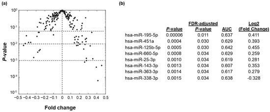 Figure 1. Biomarker discovery. (a) Differential miRNA expression in patients with breast cancer compared to those with benign breast lesions as determined by fold change of miRNA expression and statistical significance (p-value). (b) Differentially regulated miRNAs in patients with breast cancer compared to those with benign breast lesions (statistical significance determined by FDR-adjusted p-value < 0.05). Ability of miRNA biomarker in distinguishing between breast cancer and benign breast lesions was measured by area under the ROC curve (AUC).