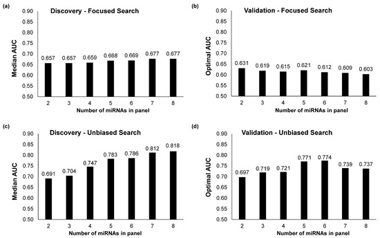 Figure 2. Biomarker panel building. Median AUC values for multi-miRNA biomarker panels identified through (a) a focused search and (c) an unbiased search in the Discovery Cohort. AUC values for optimal multi-miRNA biomarker panels from the (b) focused search and (d) unbiased search validated in the Validation cohort. The focused search refers to a search among the 8 top-ranked differentially regulated miRNAs only while the unbiased search expanded the search to all 324 miRNAs analysed in this study.