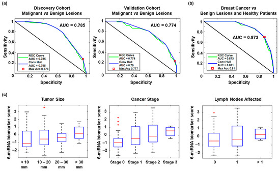 Figure 3. Biomarker panel validation. (a) ROC curves for the optimal 6-miRNA biomarker panels used in distinguishing patients with breast cancer from those with benign breast nodule in the Discovery (left panel) and Validation cohort (right panel). (b) ROC curves for the optimal 6-miRNA biomarker panels used in distinguishing patients with breast cancer from those with benign breast lesions and normal mammograms. (c) Box and whiskers plots of 6-miRNA biomarker scores in differentiating breast cancers by tumor size, stage, and number of lymph nodes affected.