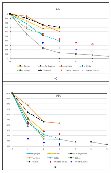 Figure 2. Overall survival (OS) (a) and progression-free survival (PFS) (b) at different time-points (1–6 years). Data points were obtained from the original papers in the text or derived from the graphs. The data points connected with full lines represent (mainly) synchronous, and with striped lines (mainly) metachronous oligometastatic disease. For comparison, in Figure 2a, the 1y and 2y OS results are shown from the Keynote-024 RCT (KN024) on metastatic disease treated with chemo (blue diamonds) or ICI (red diamonds), without LAT. Bauml: PFS-L is reported. Only ‘Bauml’ and ‘KN024 pembro’ show patients with ICI treatment.