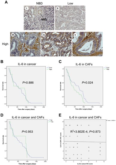 High expression of IL-6 in fibrotic stromal cells significantly correlates with shorter survival in CCA patients. (A) Representative images of IL-6 immunohistochemistry (IHC) in human CCA tissues showing faint staining (negative) in normal bile ducts (NBDs) (i) and in some cancer areas (ii), while showing strongly intense (positive) staining in fibrotic areas rich in CAFs (iii), in a few cancer areas (iv), and in both cancer epithelial cells and fibrotic areas (v). (B–D) Kaplan–Meier survival analysis for IL-6 IHC staining in cancer areas (B), or in CAF areas (C), or in cancer and CAF areas (D). (E) The relationship between IL-6 protein expression in cancer and CAFs is illustrated as scattered plots with linear regression lines. (Magnification 40×).