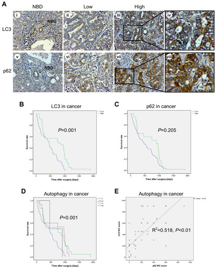 Immunohistochemical expression of LC3 and p62 in cancer cells and its correlation with overall survival of CCA patients. (A) Representative cases showing LC3 and p62 immunostaining in normal bile ducts (NBDs) (panels i and v) and in cancer areas (panels ii–iv and vi–viii). Note that p62 staining is at all times higher than that of LC3 in the cancer area considered. Original magnification is x200. (B–D) Cumulative survival analysis shows a significantly longer survival rate for CCA patients with high LC3 and low p62 expression, indicative of ongoing autophagy. (E) The relationship between LC3B and cytoplasmic p62 expression exhibits a positive correlation. (Magnification 20× and 40×).