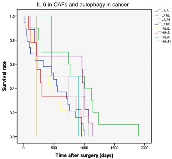 At this point, it was mandatory to check whether inflammation (marked as IL-6 production in fibrotic stroma) and autophagy (marked as LC3 up-expression and p62 down-expression in epithelial cancer cells) were correlated and how the various combinations would correlate with clinical prognosis. With regard to the IHC protein expression scores, of the 70 cases, 18 cases (25.7%) were classified as low IL-6, low LC3, and low p62 (L/L/L); 11 cases (15.7%) were classified as low IL-6, high LC3, and low p62 (L/H/L); 1 case (1.4%) was classified as low IL-6, low LC3, and high p62 (L/L/H); and 9 cases (12.9%) were classified as low IL-6, high LC3, and low p62 (L/H/H), whereas 14 cases (20.0%) were classified as high IL-6, low LC3, and low p62 (H/L/L); 9 cases (12.9%) were classified as high IL-6, high LC3, and low p62 (H/H/L); 2 cases (2.9%) were classified as high IL-6, low LC3, and high p62 (H/L/H); and, finally, 6 cases (8.6%) were classified as high IL-6, high LC3, and high p62 (H/H/H). Assuming that autophagy flux proceeds to completion when LC3 is up-expressed and p62 is down-expressed, the autophagy flux was clearly effective in 20 cases, of which 11 presented with low and 9 presented with high expression of IL-6. These numbers do not allow us to draw any convincing correlation between the level of IL-6 in the stroma and the level of autophagy in cancer cells.