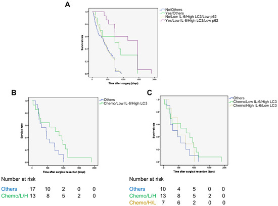 The Kaplan–Meier curves for overall survival rates according to adjuvant chemotherapy status, IL-6 in fibrotic areas, and LC3 and p62 expression in cancer. The 70 patients were categorized based on having been or not subjected to chemotherapy and the respective level of expression of Il-6, LC3, and p62 as detailed in Figure S1 (see also the text for details). (A) It is apparent that those patients who received adjuvant chemotherapy and bearing a CCA with a protein pattern of low IL-6, high LC3, and low p62 (L/H/L) expression (purple line) had an overall survival rate that was much better than any other combination; p = 0.01. (B,C) In the cohort of 30 patients subjected to chemotherapy, the group bearing a CCA with high LC3 and low stromal IL-6 (regardless of p62 expression) showed a better prognosis with respect to the group with other combinations (panel B, green line vs. blue line; p = 0.001, log-rank test) and to the groups bearing a tumor with high stromal IL-6 and low cancer cell LC3 (panel C, green line vs. yellow line; p = 0.018, log-rank test) or a tumor with any other combination (panel C, green line vs. blue line; p = 0.018, log-rank test).