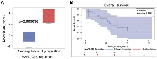 The prognostic value of autophagy marker LC3 mRNA in a cohort of CCA patients in the TCGA database. (A) Categorization of the CCA based on the level of MAP1LC3B (LC3) mRNA expression. (B) Patients bearing a CCA expressing a high level of MAP1LC3B tend to have a longer overall survival (p = 0.3761).