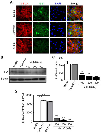 Efficacy of post-translational silencing of IL-6 in CAFs. Primary CAFs isolated from fresh CCA biopsies were transiently transfected with an IL-6-specific small interfering (si-) RNA and the efficacy of protein knockdown was tested by several methods including immunofluorescence (A), Western blotting (B), and ELISA (C). (A) The cells were stained with α-SMA (red fluorescence; a marker of CAFs), IL-6 (green fluorescence), and Hoechst (blue fluorescence; nuclei label). It is shown that si-RNA-transfected CAFs express a very low level of IL-6 (magnification 63X). (B) CAFs were treated with a control medium, scramble si-RNA, or 100, 200, or 300 nM of IL-6-specific si-RNA. The Western blotting shows a si-RNA dose-dependent reduction in cellular IL-6. The filter was stripped and re-probed for β-actin to verify protein loading. Densitometry is shown in (C). (D) An ELISA kit was used to analyze the levels of IL-6 in CAF CM after (or not after) treatment with scramble or IL-6-specific si-RNA. Values correspond to means ±SD of triplicates obtained in three independent experiments. * p < 0.05, ** p < 0.01, compared with the scramble.