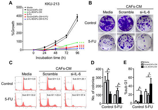 Effect of CAF medium containing IL-6 or not on the chemosensitivity of CCA cells. KKU-213 cells were incubated in a control medium or in a conditioned medium (CM) from CAFs previously transfected with scramble or IL-6-specific si-RNA and then exposed or not to the chemotherapeutic drug 5-FU as indicated in the panels. (A) Cell survival as determined by SRB assay after 48 h of culture. (B) Clonogenic assay and crystal violet staining. (C) Cytofluorometric analysis of the subG1 population after staining with propidium iodide (PI) of the cells treated as indicated. (D) The number of colonies (stained with 0.5% crystal violet) is given as mean ± SD bar of triplicate experiments. (E) Quantification and statistics of hypodiploid (sub-G1)-PI-positive cells representing the apoptotic population. Data represent the mean ±SD of at least three different experiments run in triplicate. * p < 0.05 compared to the control or medium alone.