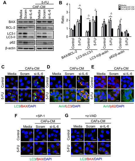 Next, we tested whether and how the conditioned media from control or si-RNA-transfected CAFs would affect the autophagy regulation and the chemosensitivity of CCA cells. To this end, we employed the KKU-213 cell line that was shown to be very aggressive in a previous study [30]. As a representative of chemotherapeutics, we chose 5-FU because it is the one mostly used for the adjuvant therapy in our cohort of patients. We monitored the cell growth of KKU-213 cells incubated for up to 96 h in a medium from control or si-IL-6-transfected CAFs and exposed to 5-FU. SRB staining, which reflects the protein mass in the culture, indicated that cell growth was stimulated by the CAF-conditioned (scramble) medium while it was inhibited by the conditioned medium derived from si-IL6-transfected CAFs (Figure 7A). More importantly, the growth was greatly inhibited by 5-FU, and even more when the treatment was performed in the cells incubated with the CAF-conditioned medium lacking IL-6 (Figure 7A). The clonogenic assay confirmed that 5-FU could inhibit the proliferation of KKU-213 cells more effectively when incubated in the medium of CAFs deprived of IL-6 (Figure 7B,D). Cytofluorometer analysis further proved that this effect was not merely due to the blockade of cell proliferation and instead was due to induction of cell death, very likely apoptosis based on the hypodiploid subG1 peak (Figure 7C,E). When treated with 5-FU, the percentage of the subG1 population (referable to apoptotic cells) in the control medium was of approx. 33%, while in the CAF-derived medium it was approx. 23% (i.e., one-third less) and in the IL-6-deficient CAF-derived medium it was approx. 57% (i.e., it nearly doubled). Finally, we asked whether the CAF-derived effects on chemoresponsivity to 5-FU were linked to autophagy in CCA cells. We further investigated the link between the CAF secretions (from scramble si-RNA or si-RNA IL-6-transfected cells) and the autophagy-dependent response to 5-FU. To this end, we first looked at the expression of the autophagy proteins LC3 and p62, of the pro-apoptotic protein BAX, and of the anti-apoptotic protein BCL-2. Autophagy was assessed by looking at the ratio of conversion of LC3-I into LC3-II (LC3-II/LC3-I is a rough measure of autophagosome formation), the ratio of LC3-II/β-actin (a rough measure of the autophagosomes present in the cell), and the ratio of p62 (SQSTM1)/β-actin (a rough measure of the autophagy substrate being degraded). In drug-untreated cultures, compared with the protein expression in cells cultivated in standard medium, the IL-6-rich conditioned CAF medium limited the activation of autophagy (reduced the conversion of LC3-I into LC3-II; accumulation of p62) and reduced the expression of BAX, whereas the IL-6-deficient CAF medium (upon si-IL-6 transfection) greatly stimulated the autophagy flux, reduced the expression of BCL-2, and restored the expression of BAX (Figure 8A,B). On treatment with 5-FU, autophagy was stimulated along with increased expression of BAX in the cells cultivated in standard medium, consistent with the induction of a toxic stress-response and the onset of apoptosis (Figure 8A,B). The 5-FU stimulated not only autophagosome formation (LC3-I is converted into LC3-II) but also the autophagy flux, as indicated by decreased LC3-II and p62 levels (indicative of effective degradation). Remarkably, this response to 5-FU was largely impaired in the cells incubated with the IL-6-rich CAF medium (from scramble si-RNA-transfected cells), while it was enhanced when the cells were treated in the CAF medium lacking IL-6 (Figure 8A,B). To better assess the functional link between autophagy and apoptosis in response to 5-FU, we performed a double immunostaining for LC3 (to mark the cells with ongoing autophagy) and for BAX (to mark the cells undergoing apoptosis). The images in Figure 8C show that 5-FU can induce BAX-mediated apoptosis only in the cells cultivated in standard medium or in IL-6-deficient CAF medium, while it is not effective in cells cultivated in IL-6-rich CAF medium. The double staining also demonstrates that apoptosis (BAX-positive) ensued in the same cells in which autophagy (LC3-positive) was induced (Figure 8C). Further, we added the staining with Annexin-V-APC (to label apoptotic cells) and p62 in addition to LC3 (as markers of autophagy). Data are shown in panels D and E (representative fields are shown; ImageJ quantification is presented in Supplementary Figure S7). The data confirm that apoptosis associated with autophagy occurs in 5-FU-treated cells, and this event is more pronounced when the cells are incubated in IL6-deprived CAF CM. Particularly, p62 staining greatly decreases in the cells incubated with si-IL6 CAF medium, which proves that IL-6 impairs the autophagy flux. Finally, to definitively prove the involvement of autophagy and apoptosis in 5-FU toxicity and their inhibition by CAF-derived IL-6, we included the treatments with Spautin-1, a drug that induces the degradation of BECLIN-1 (thus inhibiting BECN1-dependent autophagy), and with z-VAD (OMe)-fmk, a pancaspase inhibitor that inhibits apoptosis. The expression of LC3 and of BAX was determined by immunofluorescence. The representative images in Figure 8F,G (ImageJ quantification is presented in Supplementary Figure S7) demonstrate that both treatments prevented cell death by 5-FU along with inhibition of autophagy (reduced LC3 staining) or apoptosis (reduced BAX staining) when compared with the untreated cells in panel A.