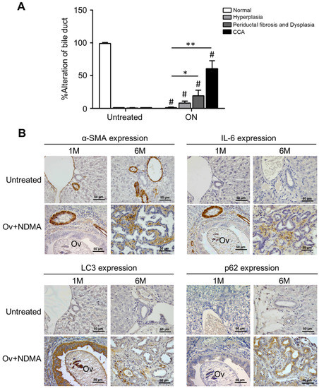 Correlation between stromal fibrosis and IL-6 with autophagy in cancer cells in an experimental animal model of cholangiocarcinoma. Opistorchis-viverrini-associated cholangiocarcinogenesis was induced in hamsters, and liver bile duct sections from animals at 1 month and 6 months post-treatment were prepared for histology and IHC analyses. (A) Histologic alterations were estimated by the pathologist as hyperplasia, fibrosis/dysplasia, and frank cholangiocarcinoma. Bile duct alteration scores of the ON and untreated groups. Significantly different at * p < 0.05 and ** p < 0.01. # Significant compared with the untreated group. (B) IHC of α-SMA (a marker of CAFs) and IL-6 in the stroma and of LC3 and p62 (markers of autophagy) in CCA cells. Apparent is the increased staining of α-SMA, IL-6, and p62 along with decreased staining of LC3 in the sections from ON-treated hamsters at Month 6. Representative images are shown (Magnification 40×).