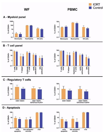 To evaluate if IORT has an impact on the absolute count of immune cell subpopulations, their state of activation or their vitality, the cellular fraction of the surgical WF was analyzed and compared to peripheral blood samples taken from the patients. None of the examined subpopulations (myeloid cells, T cells, Treg) showed different cell counts or activation states comparing IORT vs. control 24 h after treatment (Figure 1A–C). Also, no group-dependent change in the apoptosis rates of the leucocyte fraction was apparent (Figure 1D). Therefore, no impact of IORT on cellular immune processes in the local environment could be determined within the first 24 h after BCS. Further, except for monocyte counts reduced from around 10% in peripheral blood to around 1% in WF, no significant differences in the cellular composition of WF and peripheral blood were found.