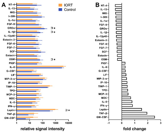 Signal intensities and calculated fold changes of the 30 cytokines with most differing levels between IORT and control group in the human cytokine array. (A): relative signal intensity, (B): fold change (>0: higher levels in IORT-WF; <0: higher levels in control-WF). N = 8 IORT vs. N = 7 control. Indicated values: mean ± standard deviation, statistical analysis by double sided t-test, * p < 0.05.