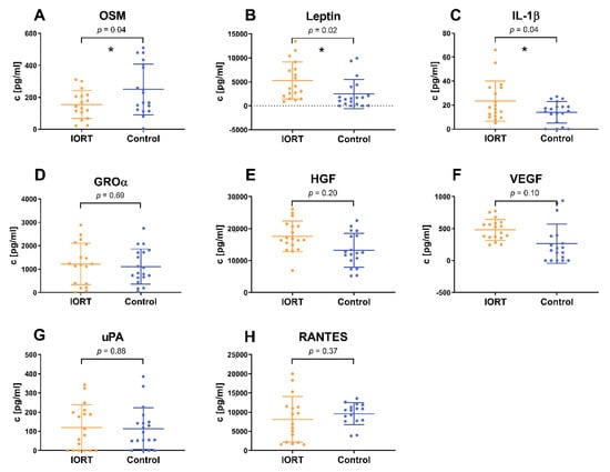 Cytokine concentrations tested in the individual WF samples by ELISA for OSM (A), leptin (B), IL-1β (C), GROα (D), HGF (E), VEGF (F), uPA (G) and RANTES (H). N = 18 IORT (yellow) and 18 control (blue), each n = 3. Indicated values: mean ± standard deviation, statistical analysis by double sided t-test, * p < 0.05.