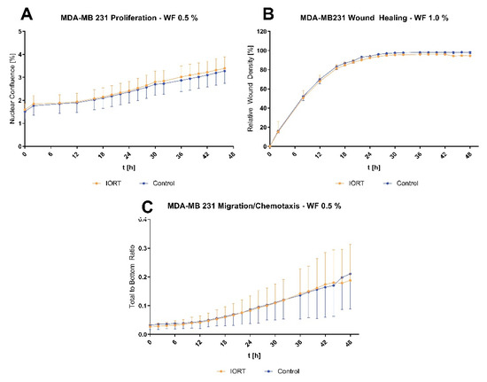 In our experimental setup, proliferation of the MDA-MB 231 cell line was not changed comparing IORT-and control-WF. Also, wound healing and chemotactic migration were not affected (Figure 4).