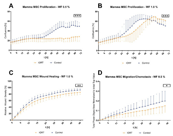 We next addressed the WF effect on mammary MSC function [20]. We observed that WF from IORT-treated patients inhibits MSC proliferation with similar kinetics after 34 h, corresponding to the cell doubling time of MSC (30–40 h) (Figure 5). Cells treated with 0.5% control-WF displayed an increased proliferation rate thereafter (mean confluence at 70 h: 49.52% vs. 28.21% in IORT-WF, p < 0.0001). Proliferation of MSC treated with 1% IORT-WF was about 6 h delayed (mean confluence at 70 h: IORT 61.67% vs. control 50.48%, p < 0.0001).