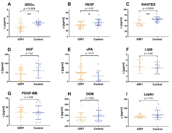 First a preliminary screening was performed. WF samples of the first 15 patients that were recruited (eight IORT vs. seven control) were individually analyzed using a semiquantitative human cytokine antibody array that detects 80 cytokines simultaneously (Human Cytokine Array C5, RayBiotech, Norcross, GA, USA). Evaluation was done with the open-source program Image J [29] and the corresponding Protein Array Analyzer tool [30]. Confirmatory ELISA tests were performed for HGF, OSM, GRO-α, IL-1β, Leptin, RANTES, uPA and VEGF (DuoSet, R&D Systems Inc., Minneapolis, MN, USA) on 19 IORT-vs. 20 control-WF samples. Due to limited sample volume, it was not possible to perform ELISAs on all 21 individuals per group (see specifications of associated figures).