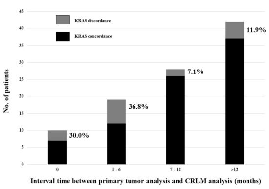 Continuous variables were reported as medians and interquartile ranges (IQR). Categorical variables were expressed in numbers and percentages. Chi-squared test was used for comparing categorical variables. To define the correlation between the incidence of KRAS discordance and the time interval between the KRAS mutation analysis of the primary colorectal tumor and the KRAS mutation analysis of the corresponding CRLM, the Pearson correlation coefficient was calculated with 2-tailed test of significance.