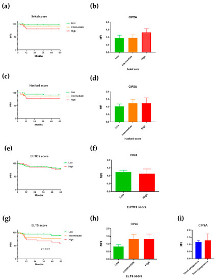 CIP2A (cancerous inhibitor of protein phosphatase 2A) protein level is independent of scoring systems and abnormal cytogenetics. Progression-free survival (PFS) and diagnostic CIP2A MNC protein levels stratified by Sokal score (a,b), Hasford score (c,d), EUTOS (European Treatment and Outcome Study) score (e,f), ELTS (EUTOS long-term survival scores) (g,h), and abnormal cytogenetics (i).