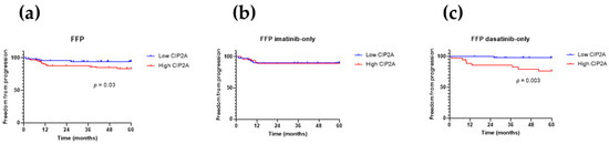 Freedom from progression (FFP). Kaplan–Meier curves for freedom from progression, stratified by diagnostic CIP2A level for (a) all 172 patients, (b) imatinib recipients, and (c) dasatinib recipients. p-values were determined using the log-rank (Mantel–Cox) test; p-values are shown where significant.