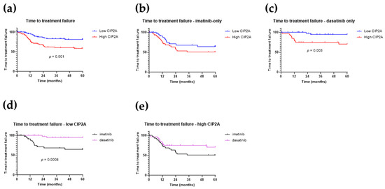 Time to treatment failure. Kaplan–Meier curves for time to treatment failure, stratified by diagnostic CIP2A level for (a) all 172 patients, (b) imatinib recipients, and (c) dasatinib recipients, (d) according to treatment received for patients with low CIP2A levels only, and (e) according to treatment received for patients with low CIP2A levels only. p-values were determined using log-rank (Mantel–Cox) test; p-values are shown where significant.