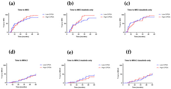 Imatinib recipients with a high CIP2A level had a significantly worse early molecular response rate (defined as a BCR-ABL1/ABL1IS ratio of ≤10% at 3 months) (p = 0.04; data not shown). The time to molecular response 3 (MR3) (BCR-ABL1/ABL1IS ratio of ≤0.1%) and time to molecular response 4.5 (MR4.5) (BCR-ABL1/ABL1IS ratio of ≤0.0032%, in the presence of at least 31,623 control ABL1 transcripts) are shown in Figure 5. The diagnostic CIP2A level, therefore, did not correlate with time to molecular response, either overall or for imatinib or dasatinib recipients alone.