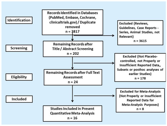 The PubMed, Embase, the Cochrane Central Register of Controlled Trials and the website of ClinicalTrials.gov were searched through until 1 December 2020. We did not apply any language or date restrictions. Key search terms included neuroendocrine neoplasms, medullary thyroid cancer, systemic therapy, and randomized controlled trial. We only included placebo-controlled RCTs comparing a targeted therapy with placebo reporting adverse-effect incidence with special focus in cardiovascular toxicities. Three of the authors (C.A., M.Y. and K.D.) worked in duplicates independently and screened all potentially eligible titles and abstracts and subsequently the full-text manuscripts to finalize eligibility. Disagreements were resolved by consensus between C.A., M.Y. and K.D.