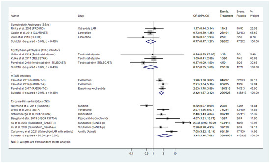 Sixteen placebo-controlled RCTs compared grade 3 and 4 AE for four different categories of targeted agents in WD-NENs and MTC (Figure 2). TKIs exhibited a pooled odds ratio (OR) for serious AE of 3.41 (95% CI: 1.46–7.96). For surafatinib AE_OR in pancreatic NENs was as high as 23.46 (95% CI: 9.99–55.09), whereas for sunitinib in the same subset of patients AE_OR was 0.52 (95% CI: 0.27–0.99), as compared to placebo. In addition, the recently tested in phase III NEN trials axitinib and pazopanib demontrated a relatively high AE_OR (axitinib AE_OR: 7.08; 95% CI: 3.83–13.14 and pazopanib AE_OR: 4.67; 95% CI: 1.31–16.71, respectively). For MTC, the effect estimates were AE_OR: 2.97 (95% CI, 1.56–5.67) for vandetanib and 2.40 (95% CI: 1.43–4.04) for cabozatinib, as compared to placebo (Figure 2).The mTOR inhibitor everolimus exhibited a pooled OR for serious AE of 2.42 (95% CI: 1.87–3.12). With regards to biotherapy, SSAs demonstrated a pooled OR for serious AE as low as 0.77 (95% CI: 0.47–1.27), which was comparable to that of the TPH inhibitor telotristat etiprate (AE_OR: 0.77; 95% CI: 0.35–1.69; Figure 2). Significant heterogeneity was observed across the subset of studies on TKI (I2 = 89.8%, p-value < 0.0001; Figure 2). A funnel plot was also produced demonstrating asymmetry (Figure S1A), that was mainly attributed to the recent studies on novel TKIs by Xu et al. on surufatinib in pancreatic NENs and by Carbonero et al. on axitinib in extra-pancreatic NENs (Galbraith’s plot; Figure S1B) [29,30]. Egger’s test showed no indication of publication bias across the included studies (p-value > 0.05). In the subset of studies on SSAs, TPH inhibitors and everolimus, we did not observe inter-study heterogeneity or publication bias (Figure 2 and Figure S1A–C).