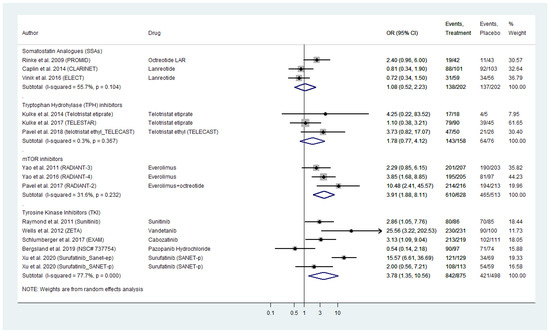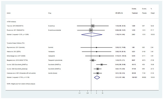 We applied the GRADE system to assess the risk of bias of the included placebo-controlled RCTs and were able to present high quality randomized evidence with a low risk of bias in most of the categories assessed (Table 2). However, inter-study heterogeneity was observed in the TKI subgroup meta-analysis for grade 3 and 4 as well as for all grade toxicities’ analyses. Complementary testing confirmed between study heterogeneity in our meta-analysis with respect to the aforementioned analyses. The studies that apparently contributed mostly to inter-study heterogeneity were the ones by Wells et al. on vandetanib for MTC (ZETA trial) and by Xu et al. on surufatinib far pancreatic NENs (SANET-p) [27,29]. Nevertheless, the studies included in our meta-analysis lacked the granularity to identify certain subsets of patients who may derive the most benefit from the administered treatments both in terms of therapeutic efficacy but also in terms of drug safety. For example, data on cardiovascular comorbidities, carcinoid heart disease, as well as detailed data on prior systemic therapies and potential additive toxicities were not available in the included studies.