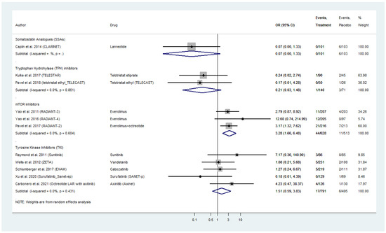 Significant heterogeneity was evident across the subset of studies on TKI (I2 = 77.7%, p-value < 0.0001; Figure 3). A funnel plot was demonstrated signs of asymmetry (Figure S2A), that was mainly attributed to the study by Wells et al. on vandetanib in MTC and Xu et al. on surufatinib in pancreatic NENs (Galbraith’s plot; Figure S2B). Egger’s test showed no indication of publication bias across the included studies (p-value > 0.05). With regards to SSA, TPH inhibitors and everolimus, we did not observe inter-study heterogeneity or publication bias (Figure 3 and Figure S2A–C).