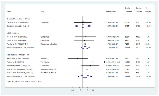 Targeted Agents’ Serious Vascular Toxicities profile per drug category in patients with Metastatic Well-Differentiated Neuroendocrine Neoplasms or Medullary Thyroid Cancer (Odds Ratio [OR] with 95% Confidence Intervals). Molecular targeted therapies were linked with higher risk for Serious Vascular Toxicities (Everolimus pooled OR: 1.72 [95% CI: 0.64–4.64]; Tyrosine kinase inhibitorsTKIs pooled OR of 1.64 [95% CI: 0.35–7.78]).