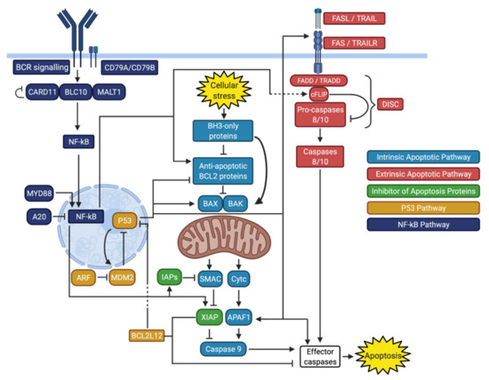 A hallmark of cancer, including DLBCL, is the occurrence and accumulation of genetic alterations that promote malignant cell survival via inhibition of apoptosis [21]. This survival advantage can be exacerbated by the selective pressure imposed by therapies such as R-CHOP and is a major factor in the development of resistance to chemotherapy [22,23]. Accordingly, relapsed and refractory DLBCL (rrDLBCL) have a distinct genetic landscape that further inhibits apoptosis, contributing to resistance to additional chemotherapy and a poor outcome [4,7,24,25]. Understanding apoptotic pathways in DLBCL and the genetic factors contributing to their inhibition has the potential to dramatically improve the prognosis of DLBCL, notably by facilitating the development of targeted therapies that could selectively relieve apoptotic blockade and therefore restore response to treatment. Herein, the genetic events leading to inhibition of apoptosis in DLBCL are described (Table 2). The intrinsic and extrinsic apoptotic pathways, as well as their modulators, will be discussed.