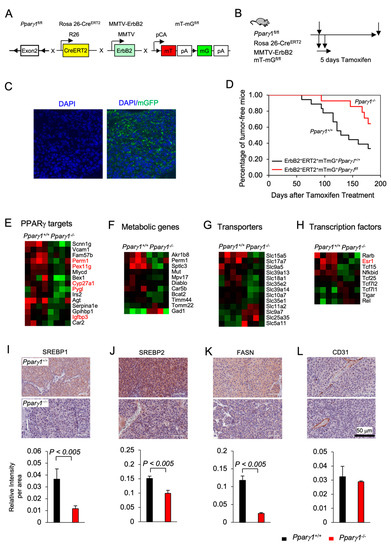 Pparγ1 collaborates in ErbB2-induced mammary adenocarcinoma, promoting Pparγ1 signaling. (A). Schematic representation of the multigenic mice treatment used to induce Cre excision from the ROSA26 locus using (B). 5 days of tamoxifen treatment. (C). Representative example of mammary gland tumors showing transgenic fluorescent of GFP reflecting Cre excision. (D). Kaplan-Meier curves displaying the onset of tumorigenesis. Data are shown as percentage of tumor free mice. Comparison is made of the Pparγ1fl/flCreERT2+mTmG+MMTV-ErbB2 (Pparγ1−/−) and the Pparγ1wt/wtCreERT2+mTmG+MMTV-ErbB2 (Pparγ1+/+) transgenic mice treated with Tamoxifen for 5 days. (E). Statistical analysis of the difference in tumor onset rates between the transgenic mice. (F–I). Gene expression derived by RNA-seq from tumors of ErbB2 mammary OncoMice with inducible Pparγ1 deletion showing mean-fold change in levels of expression. Data is shown by functional categories for individual mice tumors as color display with red for increased levels of expression and blue for reduced levels of expression in Pparγ1+/+ vs. Pparγ1−/− mammary tumors. (J–L). Representative staining of tumors derived from the transgenic mice with quantitation for SREBP1, SREBP2, FASN, and CD31 with quantitation shown as mean ± SEM for n = 3 separate mice for each genotype.