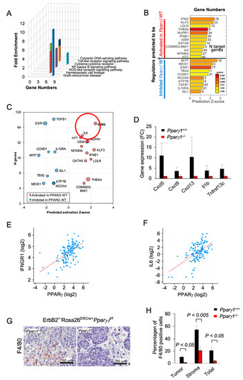 Deletion of Pparγ1 in MMTV-ErbB2 mammary tumors reduces gene expression of signaling via cytokine/chemokine and growth factor pathways. (A). KEGG pathway analysis gene expression from tumors of ErbB2 mammary GEMM with inducible Pparγ1 deletion showing mean-fold change in levels of expression. (B,C). Ingenuity Pathway Analysis (IPA) performed for mammary tumors using “Upstream Regulators” option. The results show regulators with a significant number of changed known targets and Z-score for the predicted change of the regulator’s activation state. In (B) Z-scores are shown as bars with p-values shown in color scale from red (best p-value) to yellow. In (C) results are represented by bubble plot of Z-scores vs. Number of genes (n) with size proportional to log10(p-value) and color indicating predicted increased (red) or decreased (blue) activity of the regulators in Pparγ1+/+ vs. Pparγ1−/− mammary tumors. Lower p-values are related to a more significant of number of changed targets of a regulator, and a higher Z-score indicates a better evidence of activation or inhibition of regulator’s activity based on the targets direction of change. (D). Gene expression for cytokines/chemokines upregulated by Pparγ1 from KEGG analysis. (E,F). Correlative gene expression analysis in breast cancer samples from The Metastatic Breast Cancer Project (Provisional, February 2020) between Pparγ and IFNG and IL-6 identified in (C). Correlation between PPARγ expression and expression of IFNGR1 (n = 136, Pearson 0.57, p = 17.13 × 10−14), and IL6 (n = 136, Pearson 0.55, p = 6.1 × 10−13) is highly significant. (G). Immunohistochemical staining for the tissue-associated macrophages with F4/80. (H). with data shown as mean ± SEM for n = 6 separate tumors.