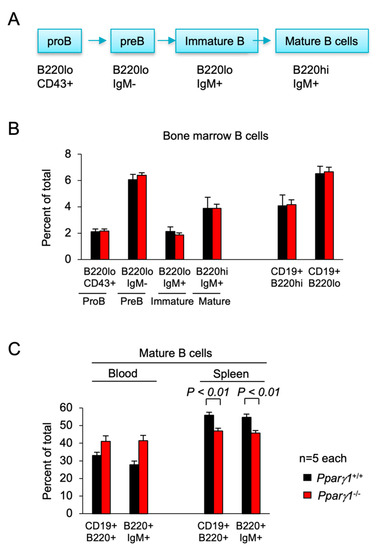 Subsorting for the proportion of ProB, PreB, immature and mature B cells in the bone marrow did not show significant differences between Pparγ1 genotypes (Figure 4A,B). Analysis of the B-cell lineage in the spleen showed a decrease in the proportion of mature splenic B cells in Pparγ1−/− mice (B220hiCD19+) (54.7 vs. 45.7, p < 0.05, Figure 4C, n = 10 total mice). There was no significant change in the CD4−CD8+ T cell compartment (Figure S4).
