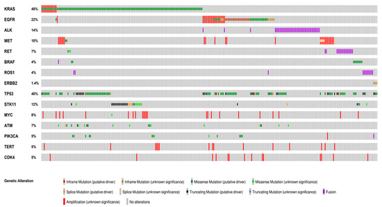 Distribution and co-occurrence of actionable and concurrent gene alterations. Oncoprint plots showing the distribution of actionable gene alterations, concurrent actionable alterations and other co-occuring gene alterations identified in more than 5% of the cases. The type of alteration is color-coded according to the legend below. Co-occurrences of actionable gene alterations included MET amplification, KRAS and EGFR mutations. The most frequent concurrent alterations were TP53 and STK11 mutations. Oncoprinter tool—cBioportal (https://www.cbioportal.org/oncoprinter, accessed on 10 March 2021).