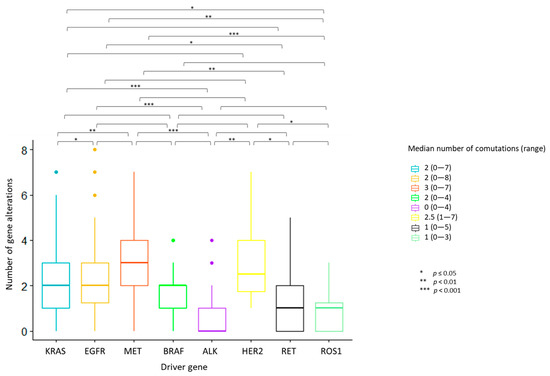 Number of concurrent gene alterations across the eight actionable gene groups. Each bar represents the number of concurrent gene alterations across the eight actionable gene groups. The median number and the range of concurrent gene alterations identified in each actionable gene group are reported in the legend on the right. Statistically significant differences in the distribution of the median number of total concurrent alterations were seen across the actionable gene groups, with the highest median number of concurrent alterations identified in MET deregulated tumors. ALK, ROS1 and RET-positive tumors displayed the lowest median number of co-occurrences. One-way ANOVA test for variance analysis. * p ≤ 0.05; ** p < 0.01; *** p < 0.001